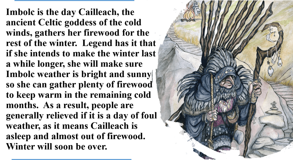 Author Patti Wigington says, “By February, most of us are tired of the cold, snowy season. Imbolc reminds us that spring is coming soon, and that we only have a few more weeks of winter to go. The sun gets a little brighter, the earth gets a little warmer, and we know that life is quickening within the soil… Imbolc is a time of magical energy related to the feminine aspect of the goddess, of new beginnings, and of fire.” ( All About Imbolc, LearnReligions.com )